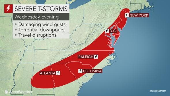 The greatest chance of severe thunderstorms from New York City to Philadelphia will be during Wednesday afternoon. Areas from Baltimore and Washington, D.C., to Charlotte, North Carolina, and Atlanta will be during late Wednesday afternoon and evening, according to AccuWeather.