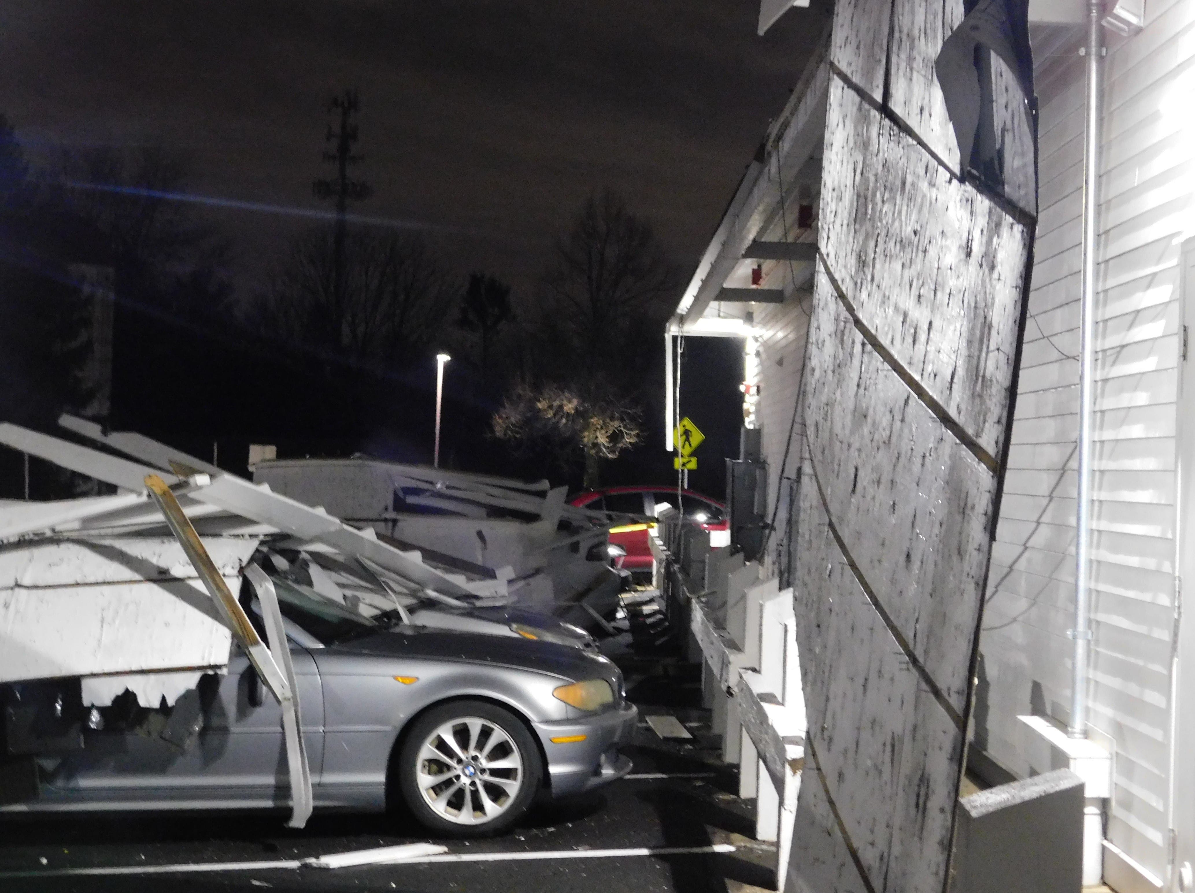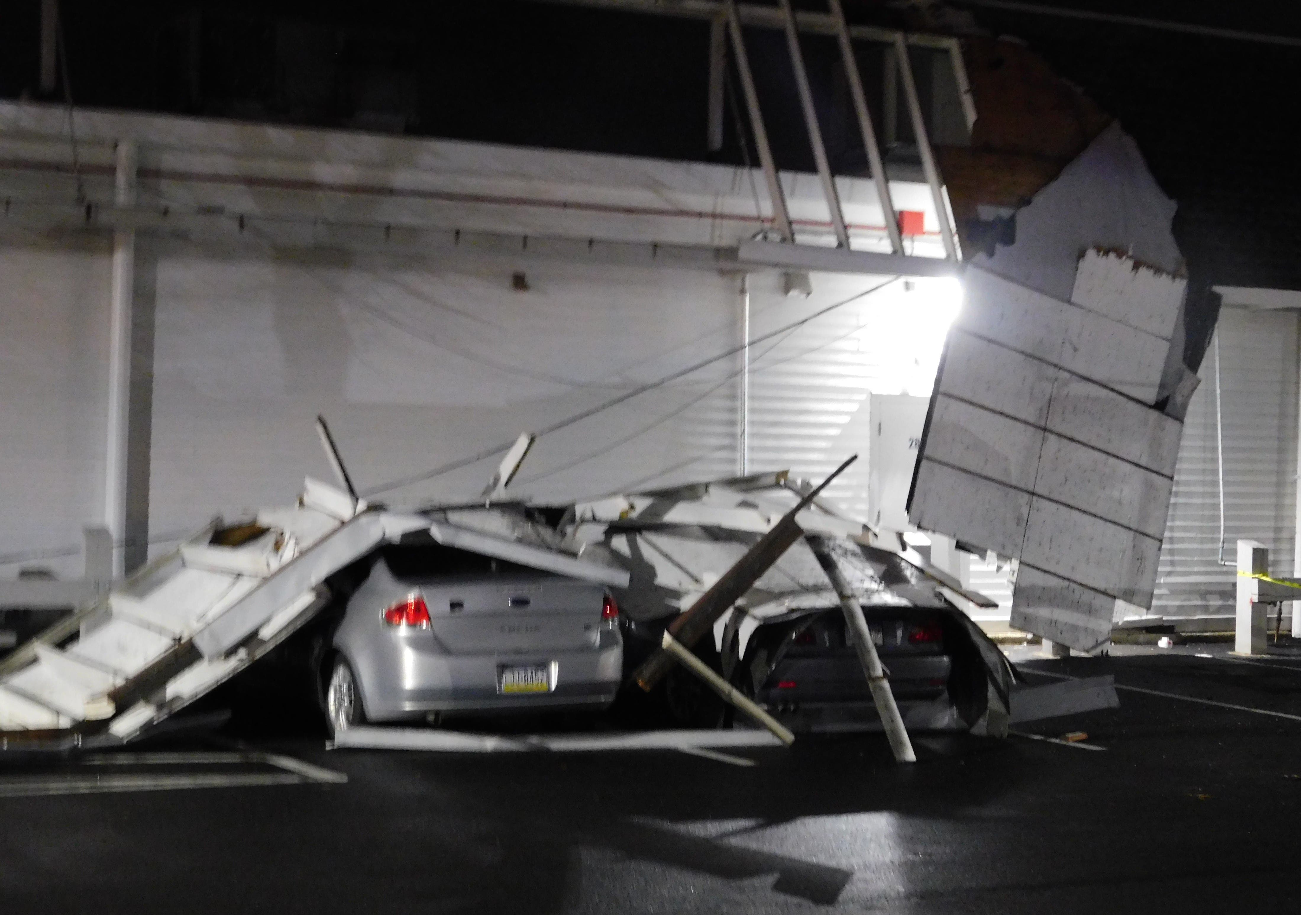 In Newtown Township, it may have spawned a small tornado as it whipped across the parking lot at the Village at Newtown Shopping Center and then tore off a section of the center’s decorative roof sending it crashing down onto a row of parked cars.