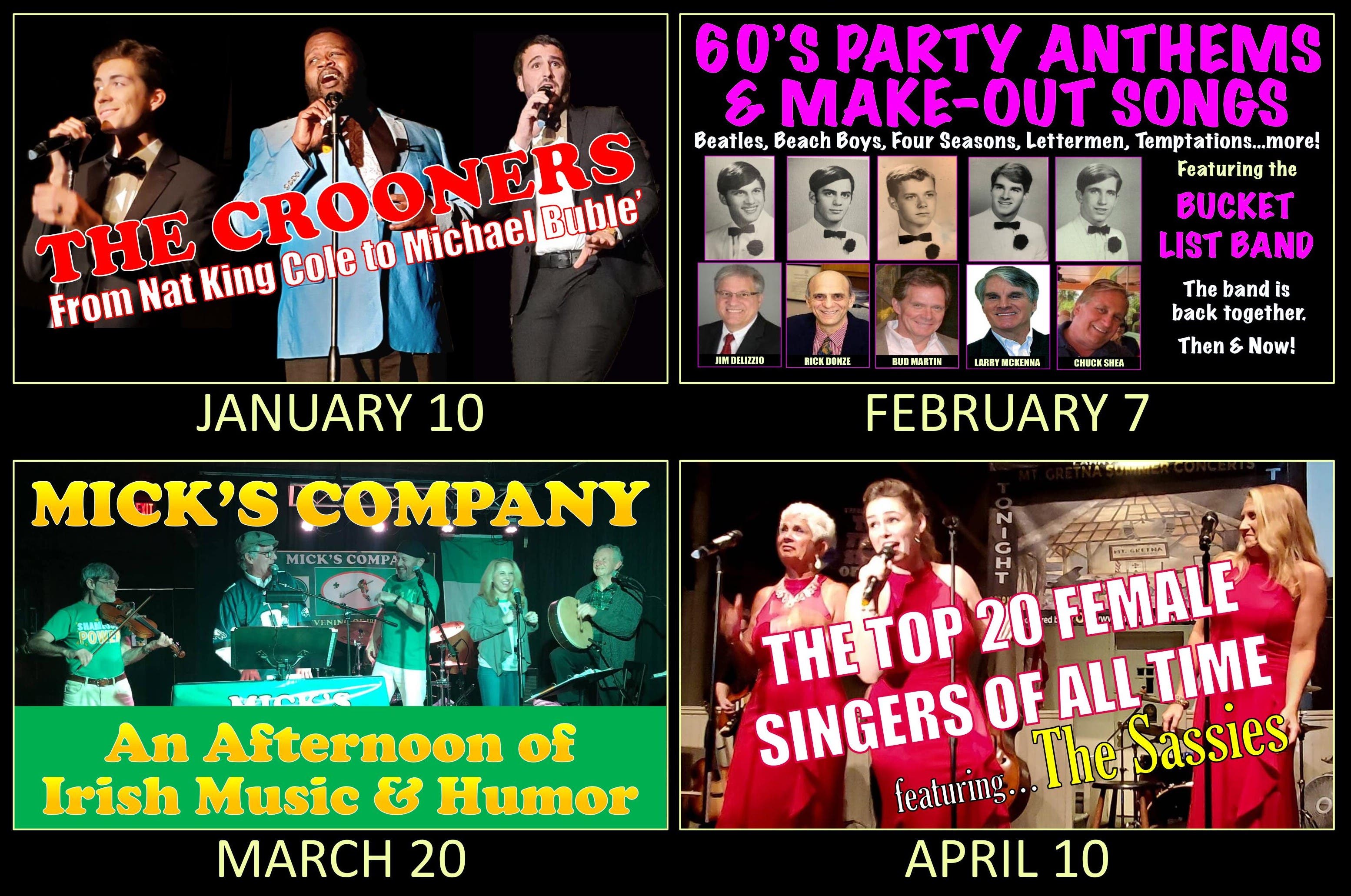 - “Party Anthems & Make-Out Songs of the 1960s” on February 7 at 3 p.m. This show will feature five high school buddies who started a band more than 50 years ago who return for “one final reunion.” Concertgoers will hear songs from The Beach Boys, The Lettermen, The Four Seasons, the Four Tops, The Temptations, Chicago, and many more.