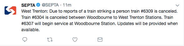 Breaking: A train hit a person on the West Trenton line Tuesday, SEPTA said.