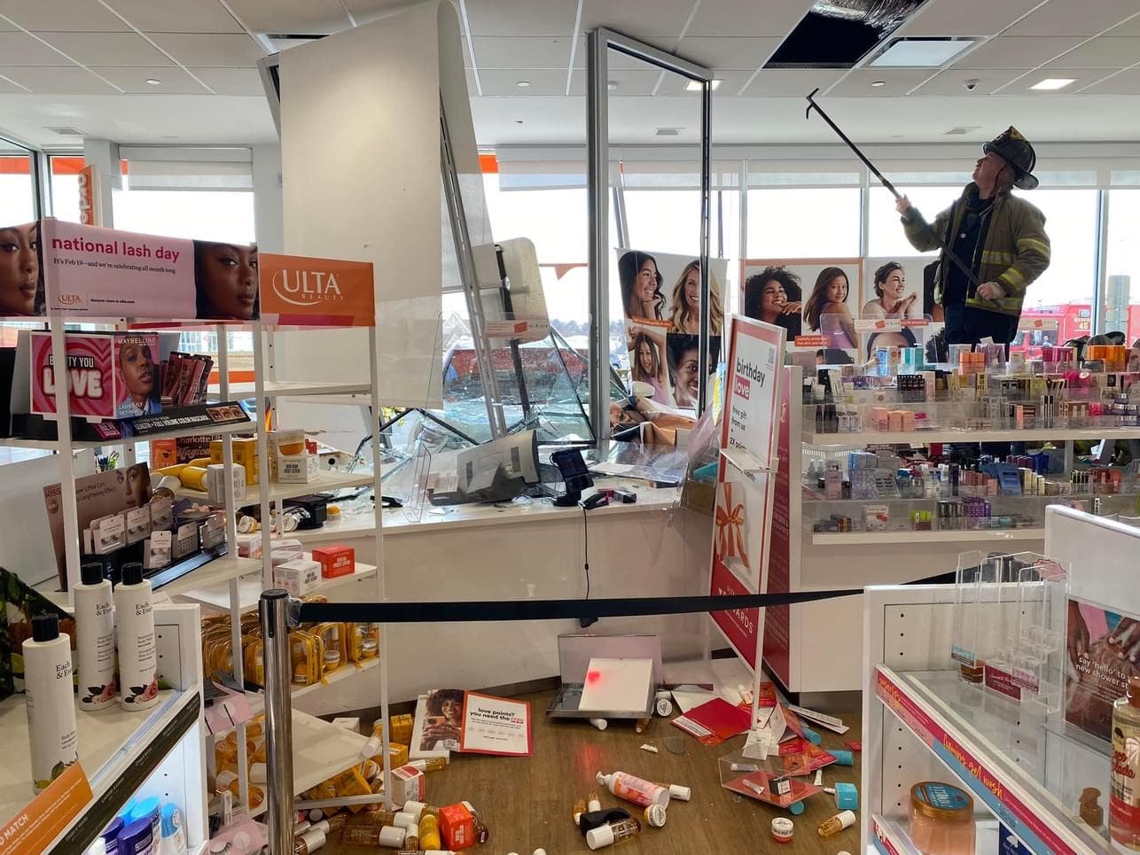 When emergency responders arrived, they found a white SUV wedged in the front of the store and a path of broken glass, damaged shelves, and strewn merchandise inside.