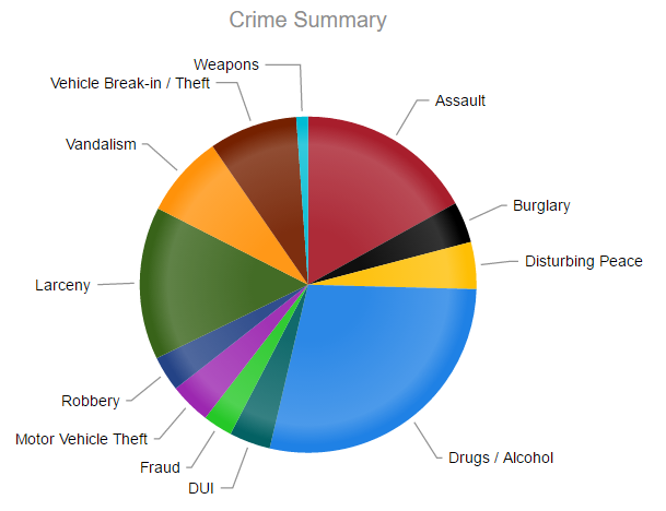 The most common offense involved drug and alcohol violations (50). That was followed by assault(30) in second, and larceny (26) in third. Vehicle break-ins (15) and vandalism (14) were the next two most common crimes.