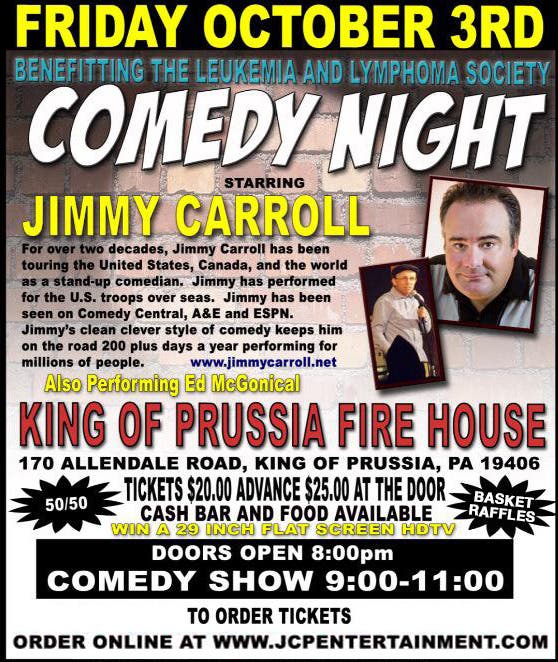 Starring Jimmy Carroll with Ed McGonical at the King of Prussia Volunteer Fire Company Banquet Hall, doors open 8:00 PM