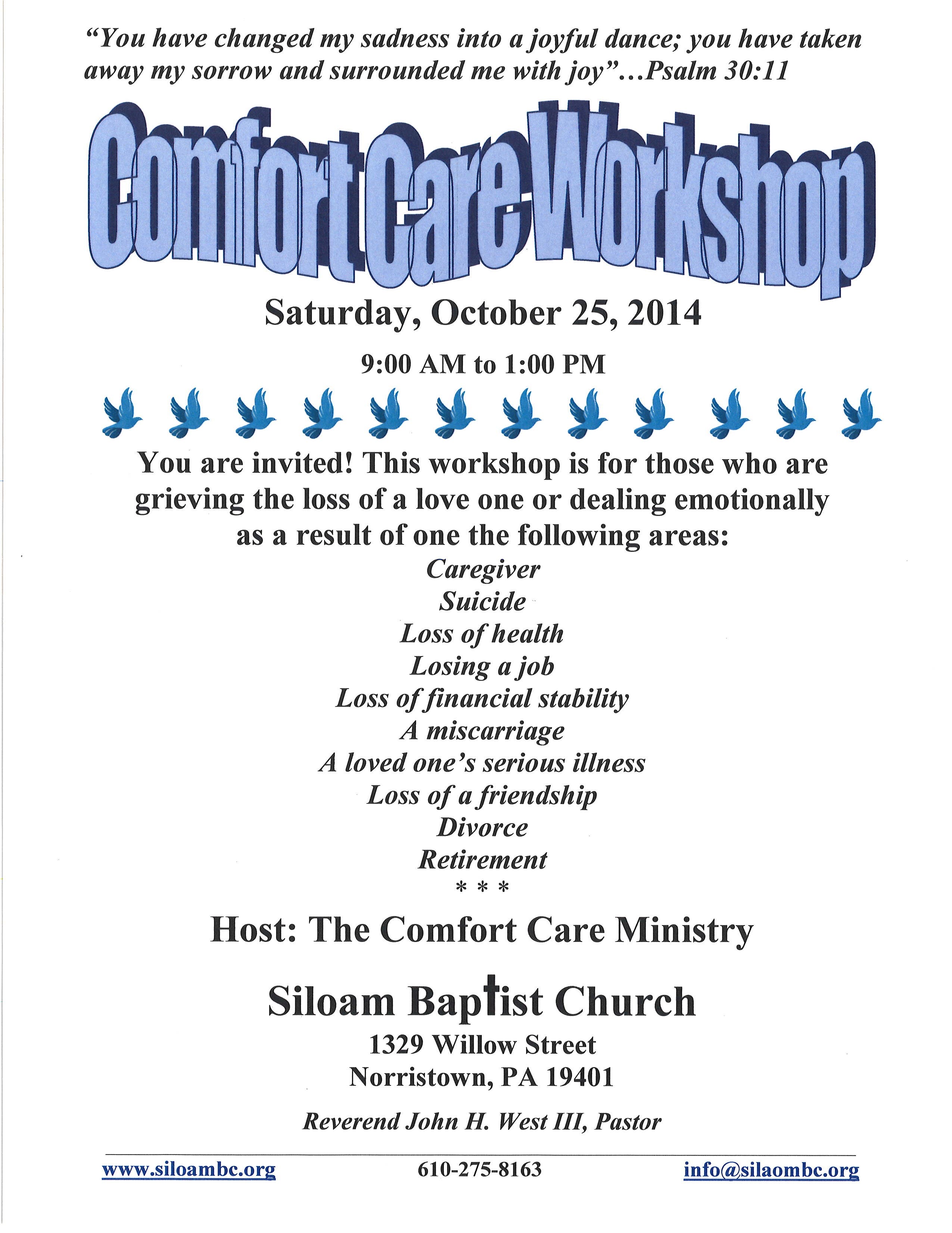 The Siloam Baptist Church Comfort Care Ministry invites you to attend this workshop for those who are grieving the loss of a loved one, or dealing emotionally as a result of one the following areas: I. e. Caregiver, Suicide, Loss of a job etc. Tell someone that will benefit from this workshop. Contact the church office for additional information at 610-275-8163.