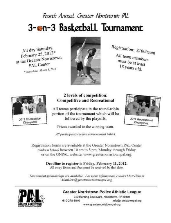 Greater Norristown Police Athletic League's fourth annual 3-on-3 Basketball Tournament will be held all day on Saturday, Feb. 25.