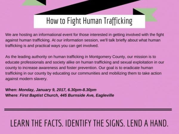 The Montgomery County anti-Human Trafficking organization is holding an informational event on Monday, January 9 at the First Baptist Church in Eagleville.