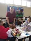 The staff of Lockheed Martin share the holidays by making a friendly visit to Montco SAAC distributing fruit baskets.