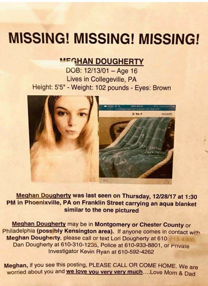 Meghan Dougherty, 16, of Collegeville, was last seen on Thursday, Dec. 28 at 1:30 p.m. on Franklin Street in Phoenixville, her family said.