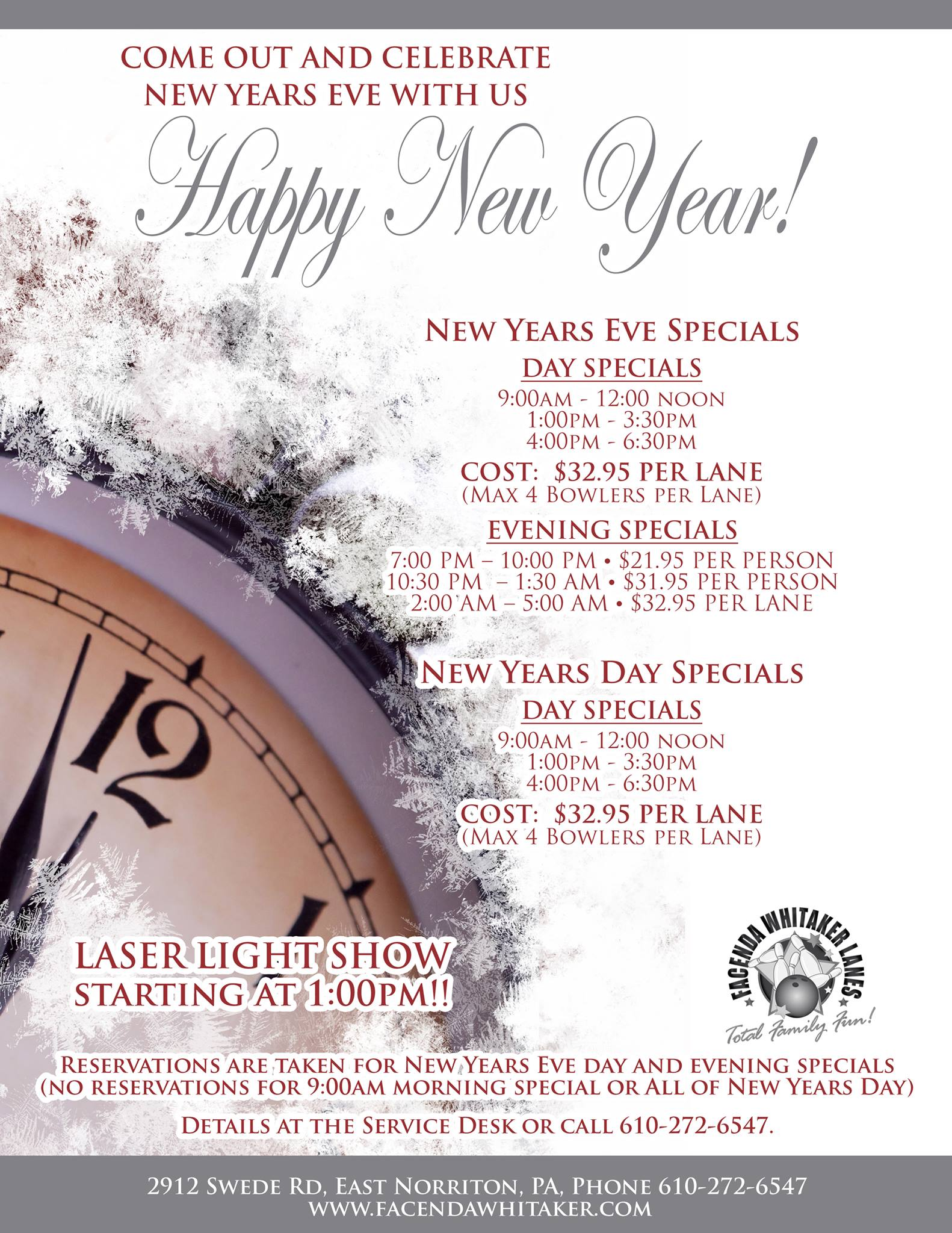 Celebrate New Years Eve at Facenda Whitaker Lanes in East Norriton! Facenda Whitaker is featuring New Years Eve and New Years Day specials all day long. Enjoy a laser light show, delicious food from Steppy's Bar & Grill, drink specials, and fun for the whole family. Make your reservations soon - this event will sell out!