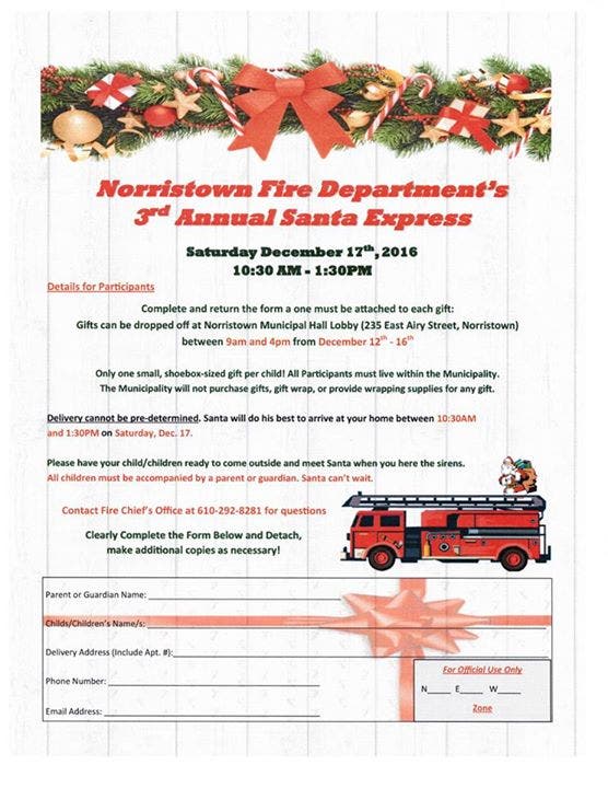 NORRISTOWN, PA -- The Norristown Fire Department will hold their 3rd Annual Santa Express on Saturday, December 17 from 10:30 a.m. to 1:30 p.m.