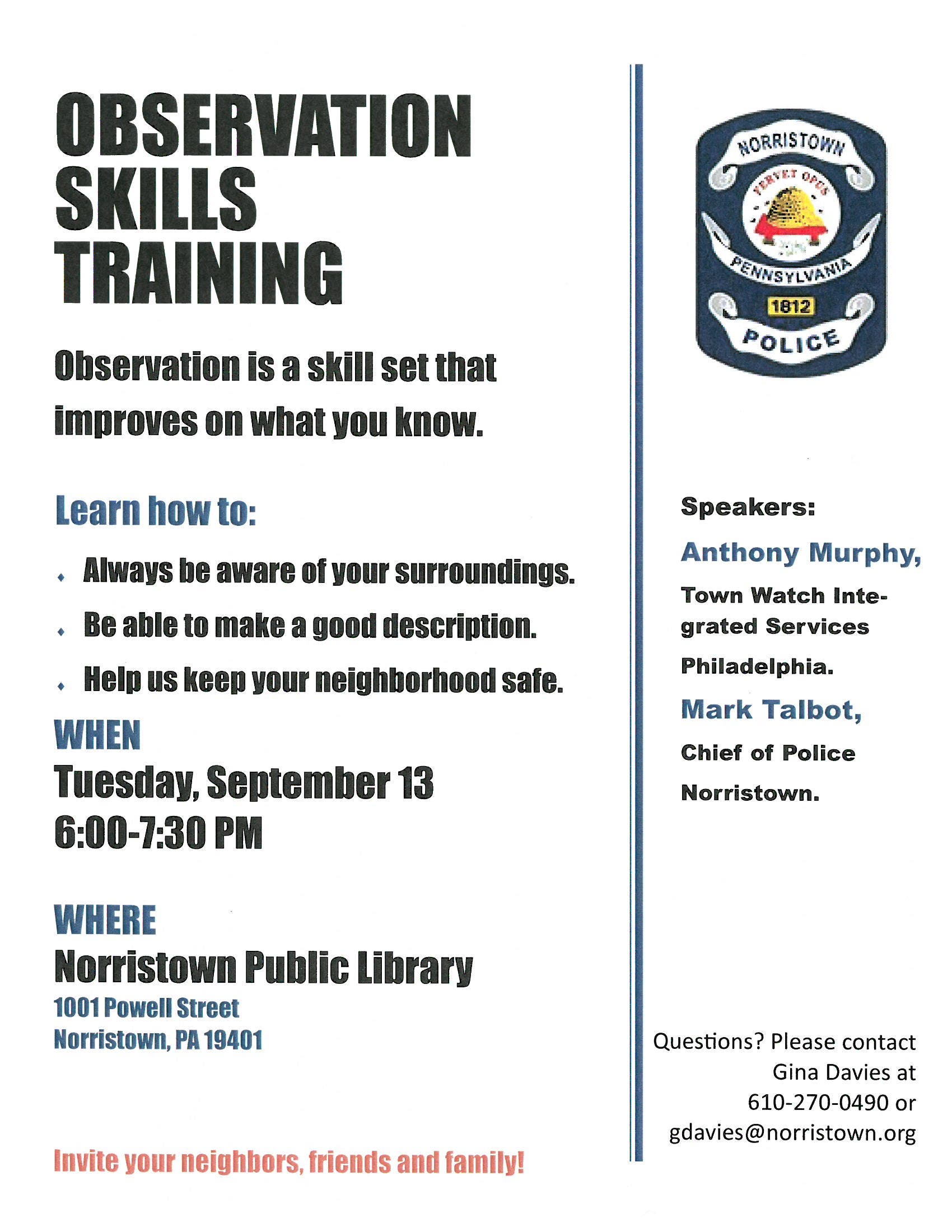 NORRISTOWN, PA -- The Norristown Police Department will hold an "Observation Skills Training" for the general public on Tuesday, September 13 at 6 p.m.