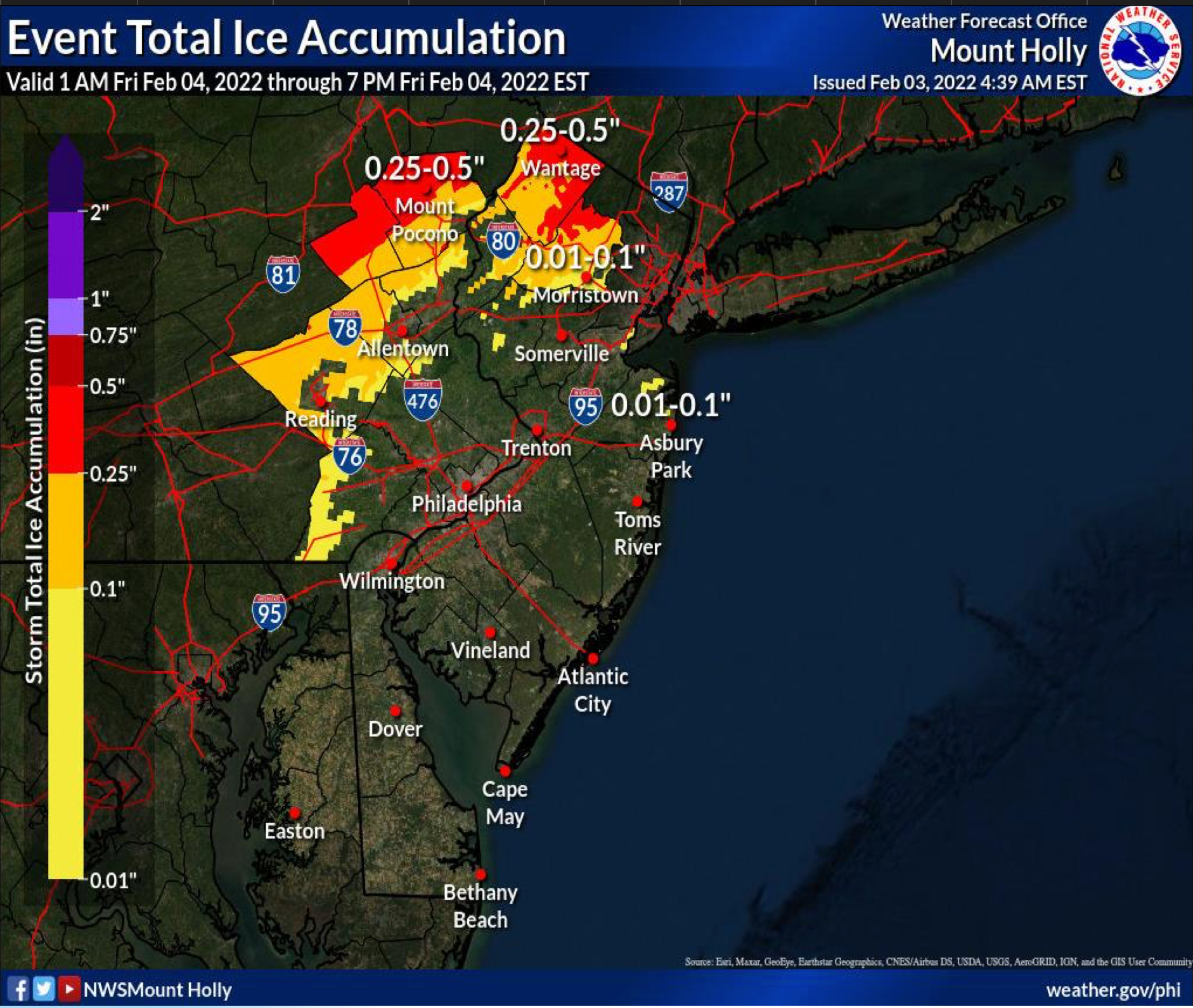 Snowfall, meanwhile, is expected as close nearby as the Lehigh Valley and Berks County.