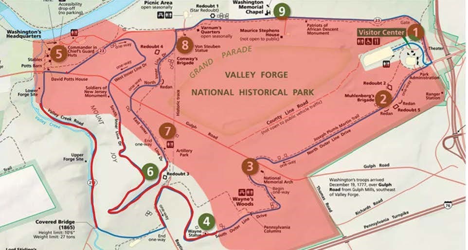 - Washington’s Headquarters, the National Memorial Arch, the Park’s Administrative Parking Lot, and the Muhlenberg Hut area