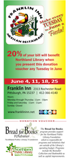 1. Bread for Books Program for Northland Library. We are happy to be participating in this program once again to help the library continue service to our community for FREE. Print out and bring this voucher to the Inn Tuesdays in June (4, 11, 18, 25) and we'll donate 20% of your bill to Northland Library in support of their great services. My family has enjoyed many trips to the library and I'm sure you have as well. If you never made a trip to Northland, please do so soon. You'll fall in love with the library too! Read the post I wrote last time we participated for more information: http://www.franklininnmexicanrestaurant.blogspot.com/2011/09/when-was-your-last-visit-to-library.html