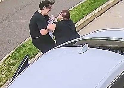 Becky Arbaugh, right, comes to the aid of 11-week-old Myles at the drive-thru. (Taco Bell)