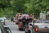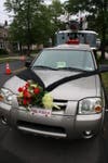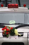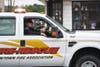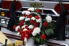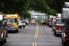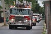 The line of mourners' vehicles and fire trucks with their lights on and sirens eerily silent passed down Radcliff Street as neighbors and onlookers gathered to watch.