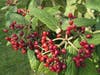 Darts Duke Viburnum (Viburnum x rhytidophylloides ‘Darts Duke’). This semi-evergreen shrub has extra large, leathery, dark green leaves and huge six to ten inch creamy-white flowers in May. In the fall, its bright red fruit slowly darkens. This shrub will tolerate heavy shade or full sun and grows 8 to 10 feet high. This disease- and deer-resistant shrub may re-bloom in October. It makes a great specimen, or plant it as a screen or hedge.