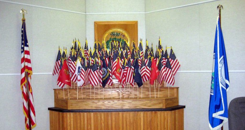 When the program first launched, 24 residents were known to be serving in the military. The flag display holds flags representing the branch of service and identifying the resident with a yellow streamer with his or her name affixed to it. When the person returns home, his or her military flag is replaced with an American flag.