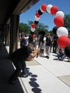 : Mick Petrucci, President of the Newtown Business Association, smashed a guitar during School of Rock's grand opening celebration Saturday. Read more local news on Newtown Patch.
