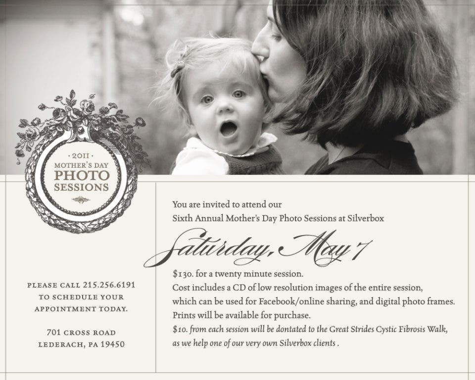 You are invited to attend the Sixth Annual Mother's Day Photo Session. $130 for a 20-minute session includes a CD of low-resolution images from the entire session, which can be used for online sharing or digital photo frames. Prints will also be available for purchase. $10 of each sitting is donated to the Great Strides Cystic Fibrosis Walk, as we help one of our own Silverbox clients.
