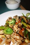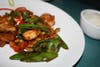 For the braver palate types, there is squid with black bean sauce. If there were a blindfolded taste test, the dish could almost be considered chicken with black bean sauce. The oceanic accent accompanies onions, cabbage, sections of carrot, halved baby corn, asparagus spears, zucchini, green pepper shards and the crunchy tops of broccoli.
