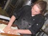 She is still moving at 10 a.m. Pie and tart shell dough is kneaded, cut, formed and filled. Any special orders for the afternoon are started and shortages of baked goods in the displays are taken into account.