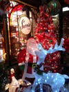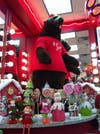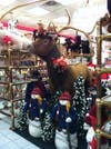 A cluster of huge stuffed animals (including at least one reindeer) stand vigil around a plush Santa on one side of the shop. Parked on the other side is an even larger stuffed bear—this one donning a Sarris T-shirt.