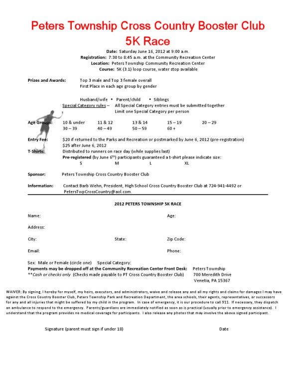 The annual Peters Township 5K will benefit the PTHS Cross County Team. Registration begins at 7:30 a.m. and the race begins at 9 a.m. This is a 5K loop course with water stops.Â