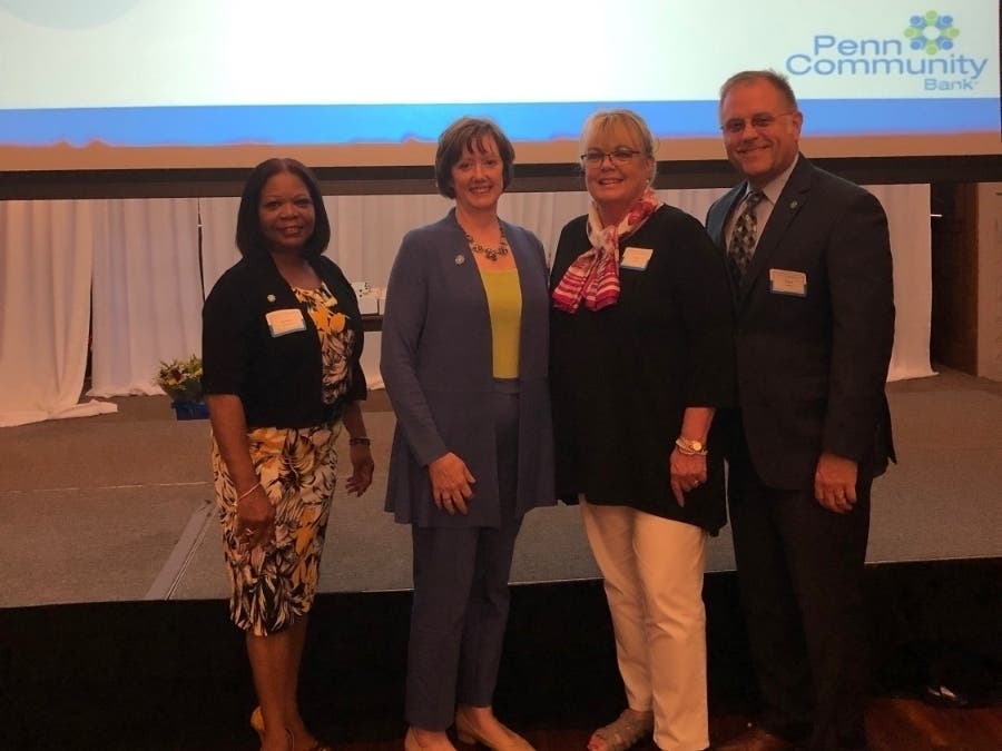 PHOTO CAPTION: Penn Community Bank President and CEO Jeane M. Vidoni (second from left) congratulates three team members for marking 35 years of service to the bank, including, from left, Mortgage Loan Officer Lenora Williams, Staff Accountant Anne Kriebel, and Chief Relationship Officer Todd R. Hurley.