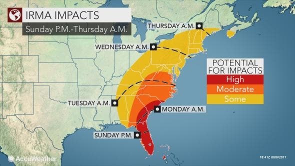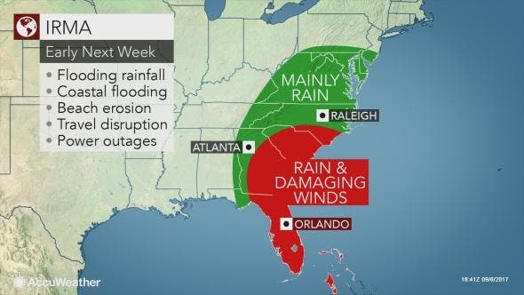 At the very least, heavy rain is forecast to spread inland toward the southern Appalachians, potentially leading to extensive flooding due to the mountainous and hilly terrain. Damaging winds will become less of a concern the farther inland Irma moves. Some of Irma's rain may reach into the mid-Atlantic and Northeast toward midweek, according to AccuWeather.