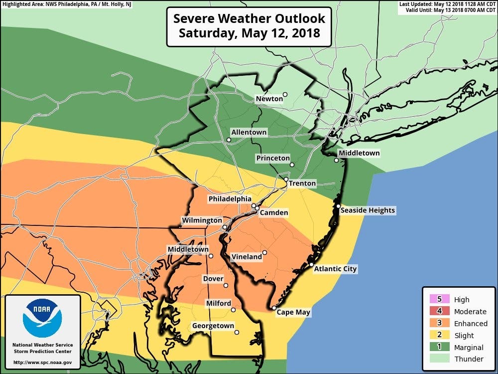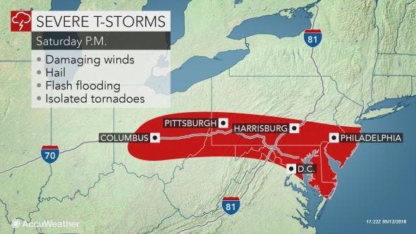 - Thunderstorms were expected to develop Saturday afternoon. A favorable setup for severe storms will evolve late this afternoon and evening in southeastern Pennsylvania, eastern Maryland, southern New Jersey, and Delaware as these storms move eastward across the area during the 5 to 10 p.m. timeframe.
