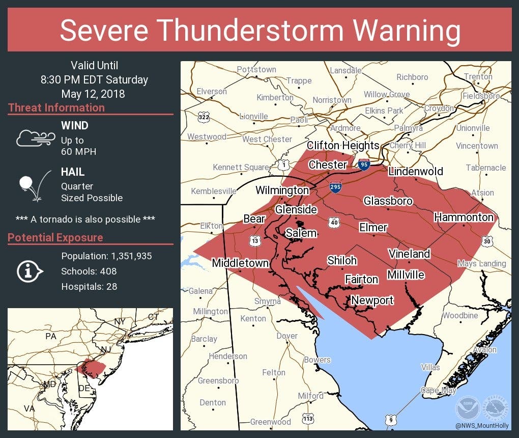 A severe thunderstorm warning was in effect temporarily in southern New Jersey and eastern Pennsylvania.