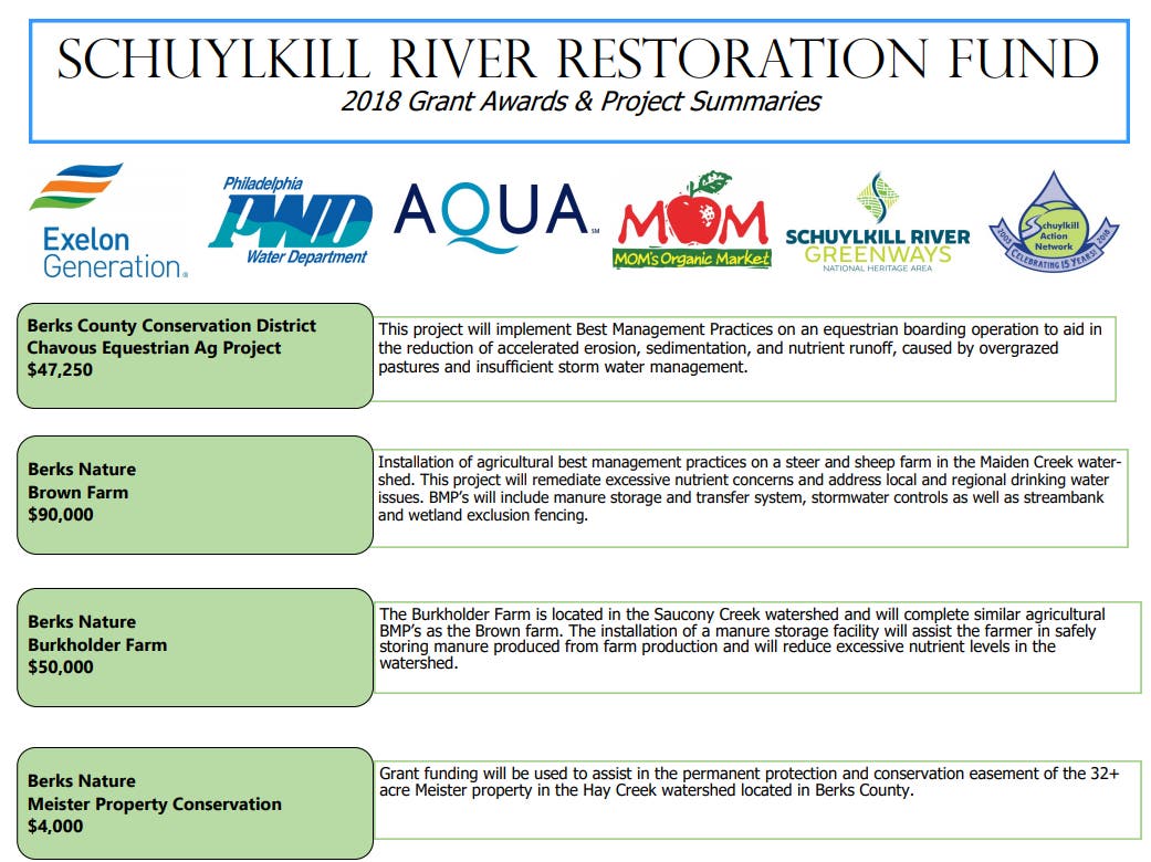 The grants include projects that are both local and upstream, and will impact the health of the entire Schuylkill River watershed.