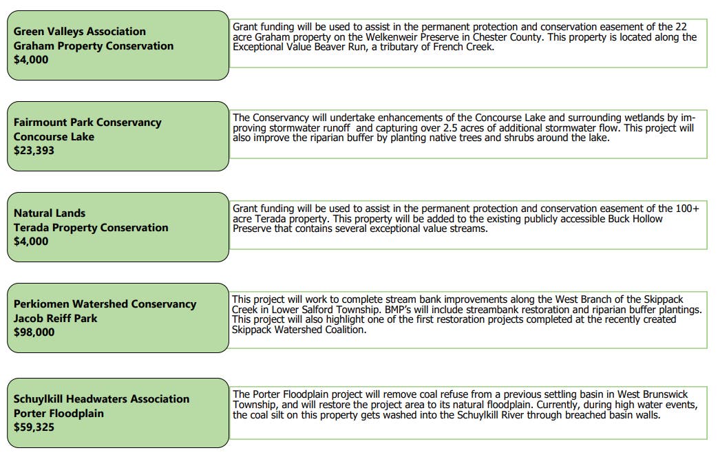 In Montgomery County, the Perkiomen Watershed Convervancy was awarded $98,000 for streambank restoration along the west branch of Skippack Creek in Lower Salford.