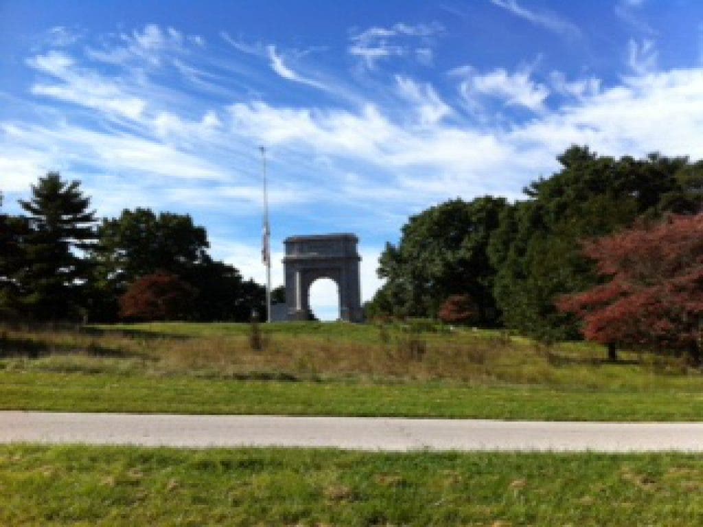 One of the best things about training here in Phoenixville is being so close to Valley Forge National Park! This morning the park was filled with walkers, bikers, runners, strollers, dogs and many people taking advantage of a beautiful morning! I took another loop around the park and broke in my new shoes. If you have never done the full loop, its 5 miles if you stay on the path. Filled with hills, turns and lots of traffic-its a great way to get in some steps prior to October 5. There is plenty of areas to stop along the way for water and such but the scenery is the main attraction. The park is seeing hints of fall -- with some leaves starting to turn. I have included a picture I took this morning.