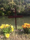 The memorial cross in the grass embankment bears the names of the victims on the horizontal beam. On the vertical beam it reads “R.I.P. Gone but not Forgotten.”
