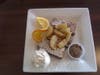 From the “Day’s Breakfast Specials,” my cousin Ed chose the Apple Cake French Toast ($7.99) which was three pieces of cinnamon apple cake dipped in batter, baked, topped with cooked apples and served with sides of whipped cream and cinnamon sugar butter. It was heavenly, especially when you spread the cinnamon sugar butter over the warm cake pieces and topped it off with whipped cream. The waitress brought a pitcher of pancake syrup, but it wasn’t needed—the cinnamon sugar butter and apples gave all the sweetness (and extra fruity depth) that the dish needed.
