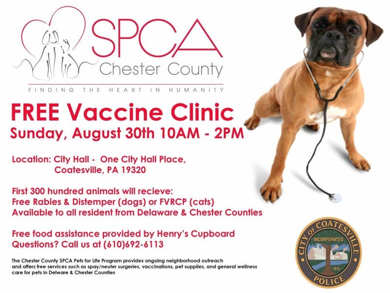 The Chester County Society for the Prevention of Cruelty to Animals (SPCA) is offering a free vaccine clinic for pets in Chester and Delaware counties on Sunday, Aug. 30.