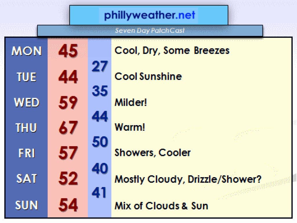 Our weather week starts out cold, with lows around 20 degrees on Tuesday morning and cool highs in the lower- and mid-40s on Monday and Tuesday. We will warm markedly as the cold high moves off the coast and those warm breezes commence for Wednesday (near 60 for a high) and Thursday (the push to 65 or warmer). However, a cold front reaches the region early Friday and may stall nearby.
