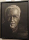 The white-haired man stares out from his portrait, engulfed in dark sepia tones with a lone flicker of color— the tiny red-orange glow at the end of his cigarette.
