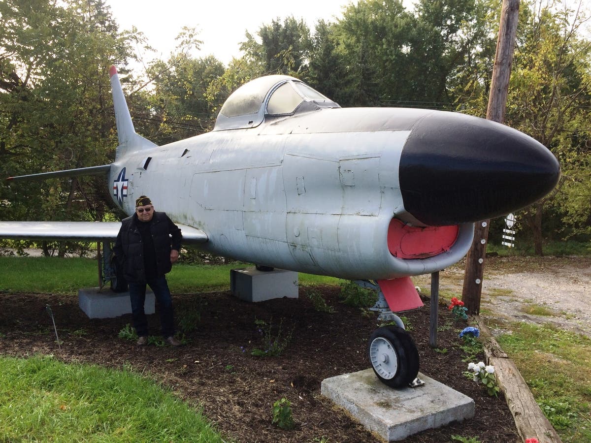 Veterans of Foreign Wars Montour Valley Post 7714 Commander Robert A. Haag stands next to his unit's F-86 Sabre jet on Steubenville Pike.