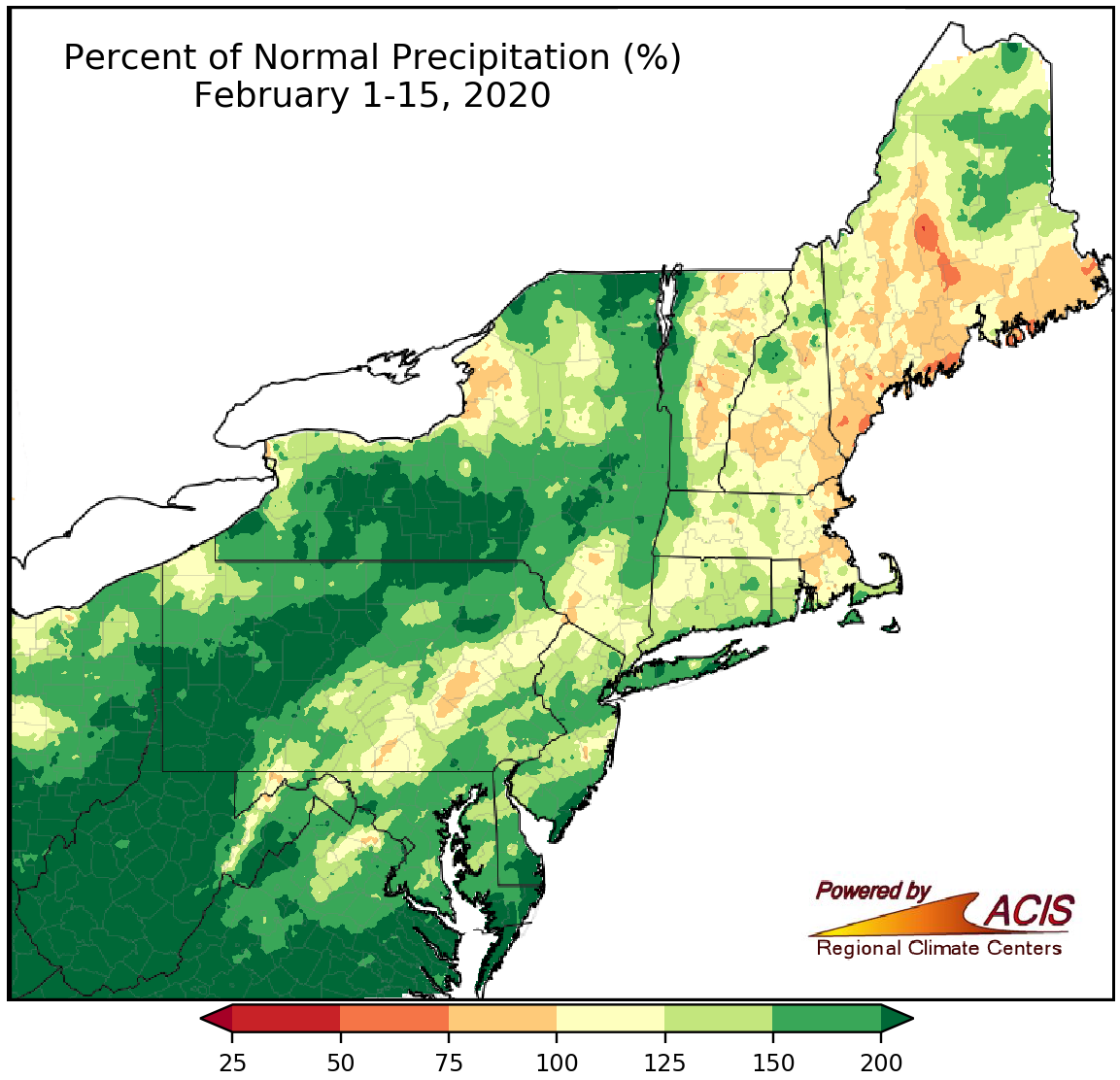 Thirty-five major climate sites tracked by the agency were warmer than normal, with temperatures in Allentown, Pennsylvania, among the highest in the region above normal. There, temperatures have been 9.7 degrees above normal between Feb. 1 and Feb. 15.