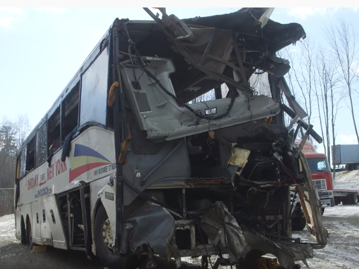 The crash occurred when a tour bus lost control after passing a FedEx tractor-trailer, causing it to hit the concrete median barrier and forcing it up an embankment before it rolled onto its side.