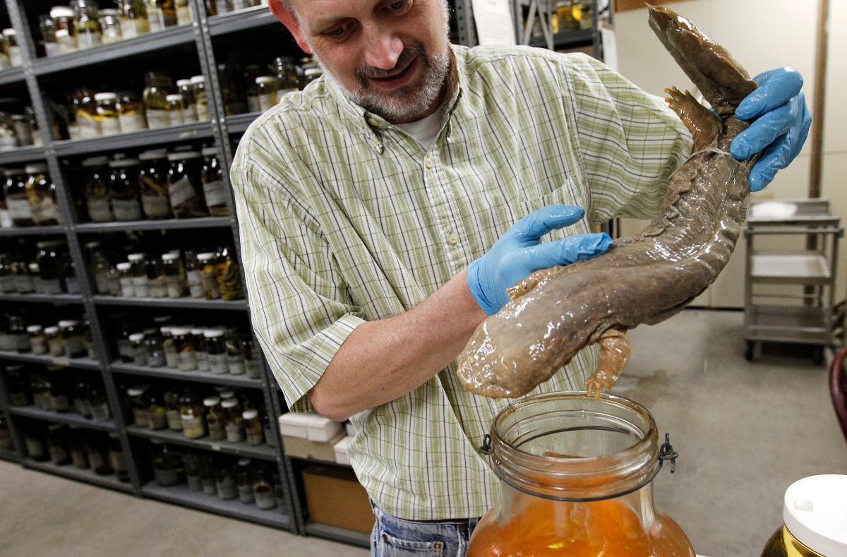 In this March 23, 2012, file photo, Ned S. Gilmore, collections manager of vertebrate zoology, shows a hellbender salamander in the collection at the Academy of Natural Sciences in Philadelphia. Pennsylvania is getting an official amphibian, a nocturnal salamander that can grow to be more than two feet long. The House voted 191-6 on Tuesday, April 16, 2019, to grant the honor to the Eastern hellbender, and Gov. Tom Wolf's office said he plans to sign it.
