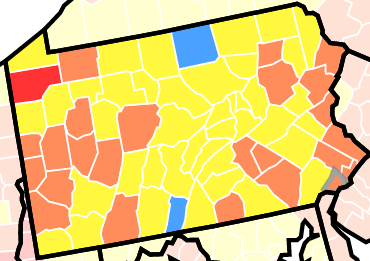 One county, Crawford in northwestern Pennsylvania, has a high community transmission spread. Twenty-four others have substantial spread.