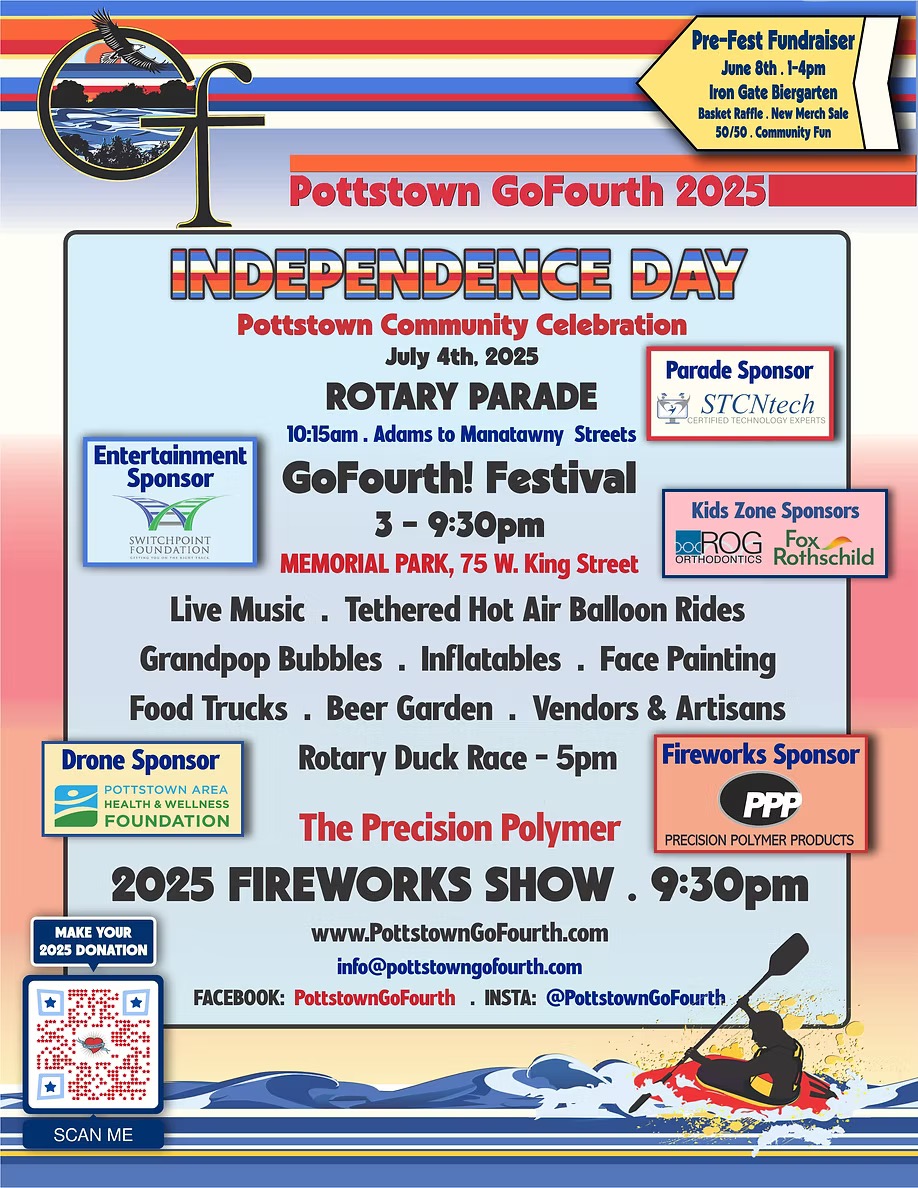 The annual Pottstown GoFourth festival is set for July 4 at Memorial Park in Pottstown. The event runs from 3 p.m. to 9:30 p.m. with fireworks at the end. The day begins with a Rotary Parade at 10:15 a.m. from Adams Street to Manatawny Street.