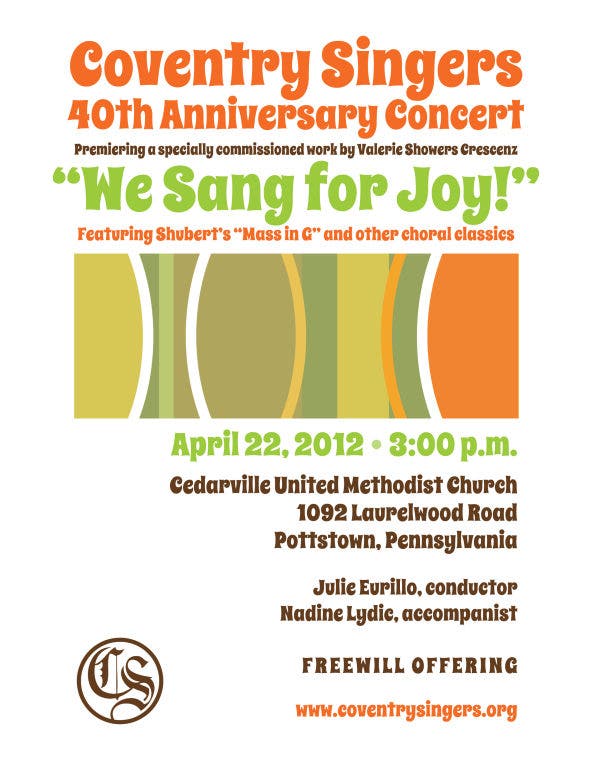 The Coventry Singers will be premiering a work by Valerie Showers Crescenz commissioned specifically for the 40th anniversary.