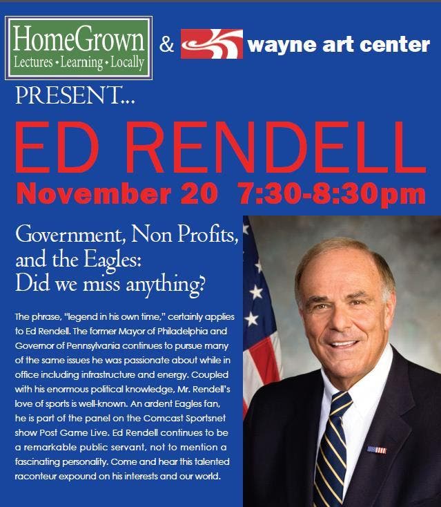 The Wayne Art Center will host Ed Rendell for the second season of HomeGrown: Lectures, Learning, Locally at 7:30 p.m. on Nov. 20.