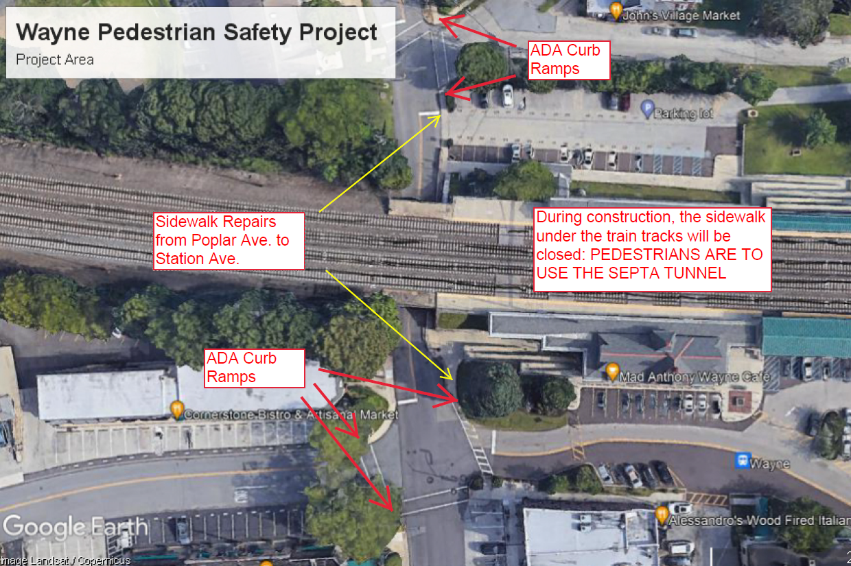- installing five ADA curb ramps at Poplar Avenue, Station Avenue (station side), North Wayne Avenue (west side), and West Avenue (north side);