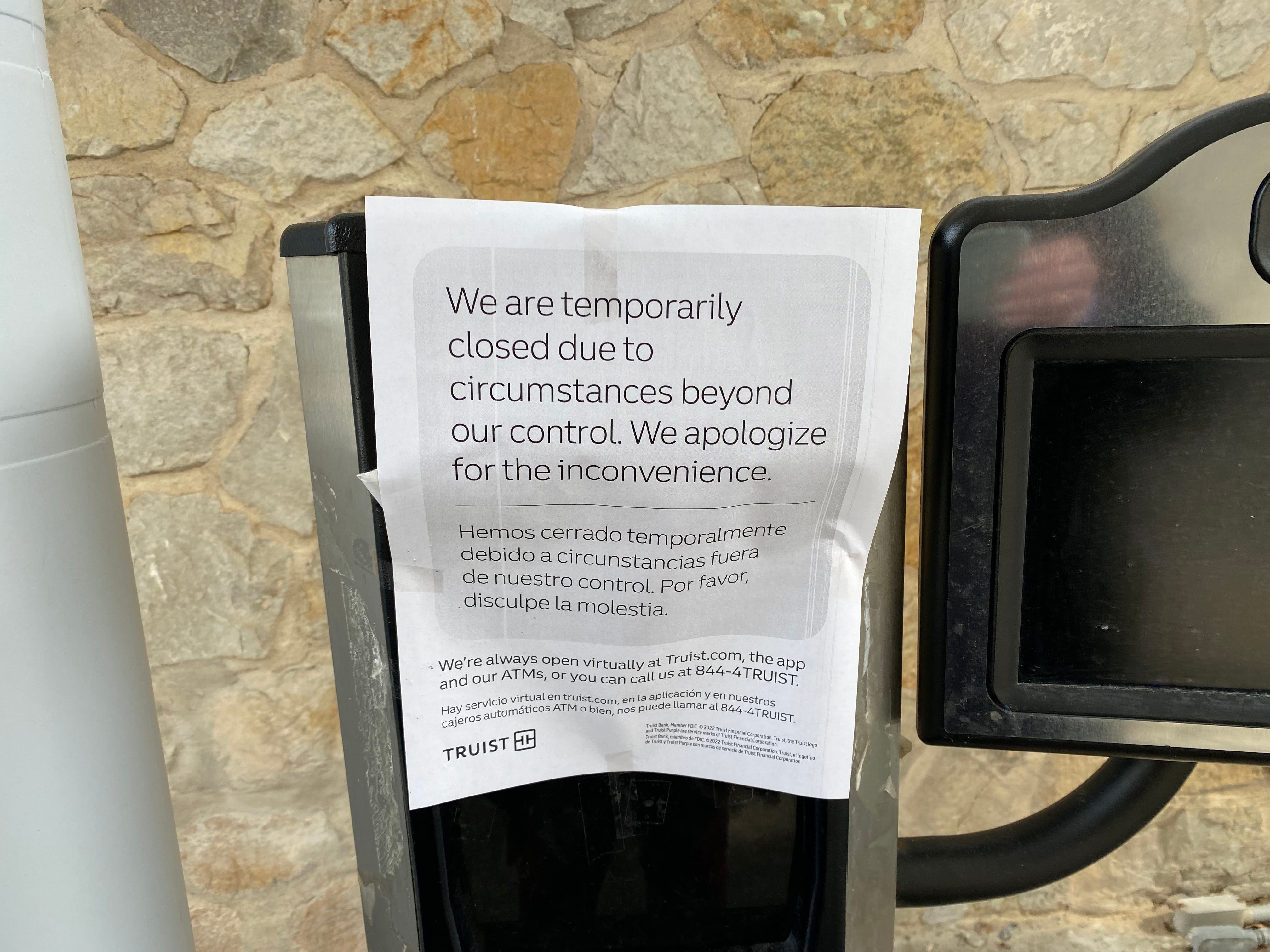Truist Bank posted a sign in its drive-through saying the branch is closed due to circumstances beyond it's control.
